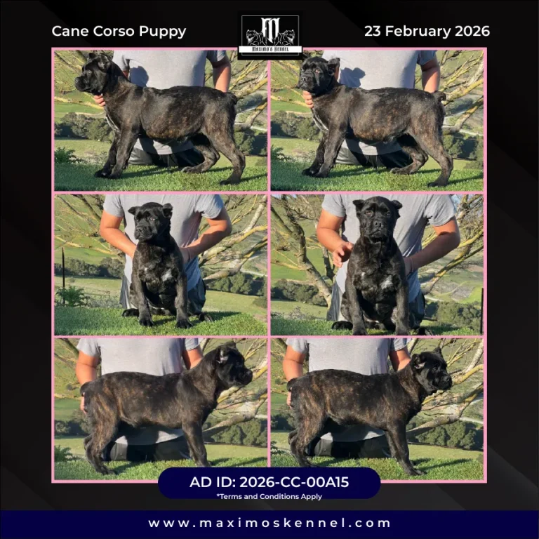 Cane Corso Mastiff puppies available in all standard colors – Black, Blue, Black Brindle, Chestnut Brindle, Fawn, Formentino. We have young puppies, more mature pups at several months of age, and sometimes young adults for sale.