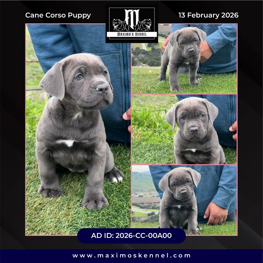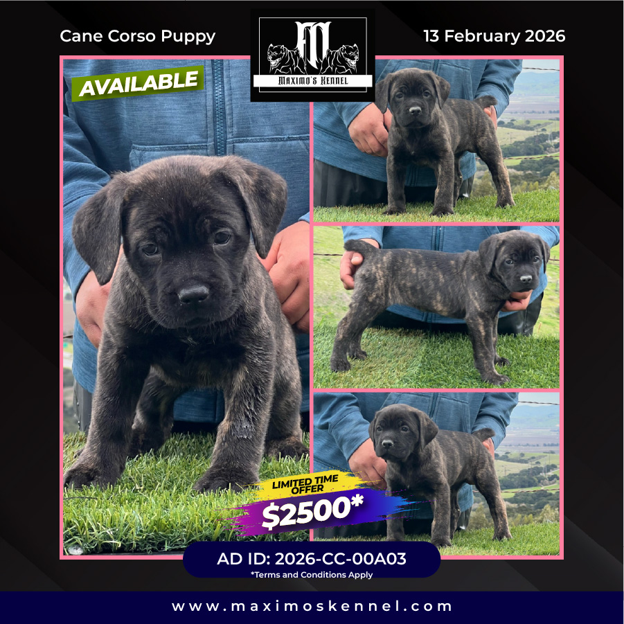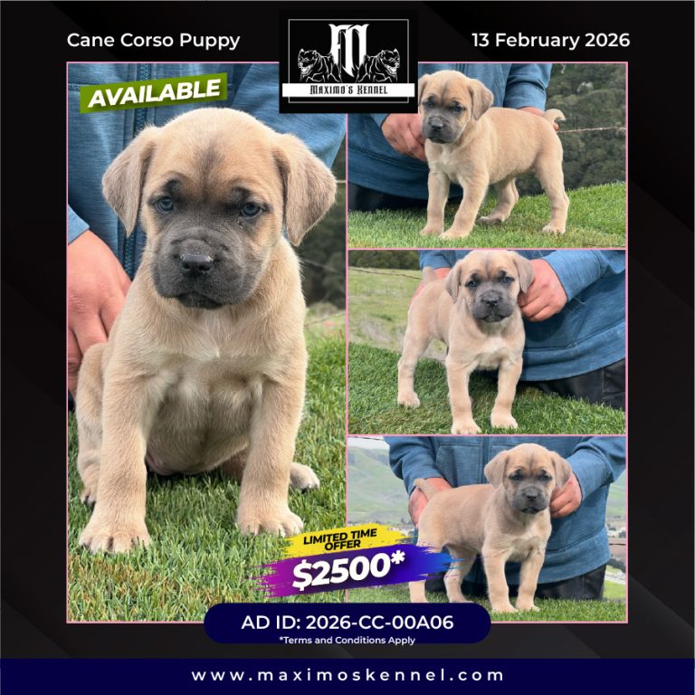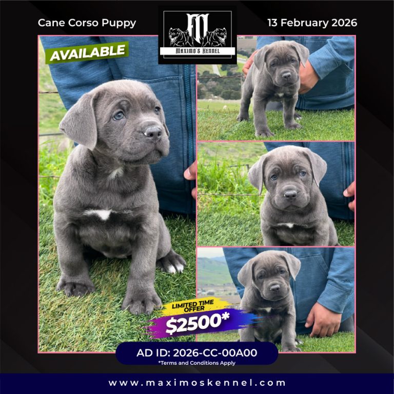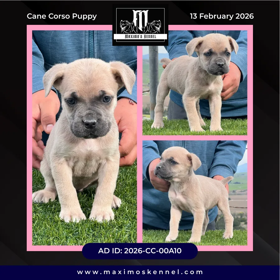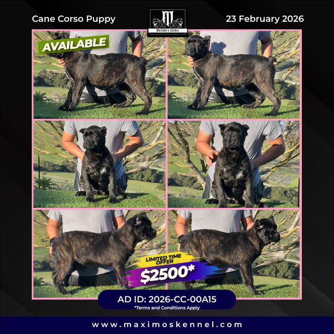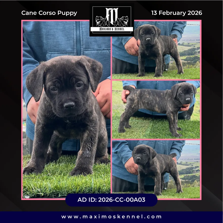 Cane Corso Mastiff puppies available in all standard colors – Black, Blue, Black Brindle, Chestnut Brindle, Fawn, Formentino. We have young puppies, more mature pups at several months of age, and sometimes young adults for sale.